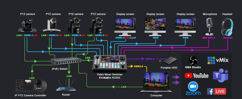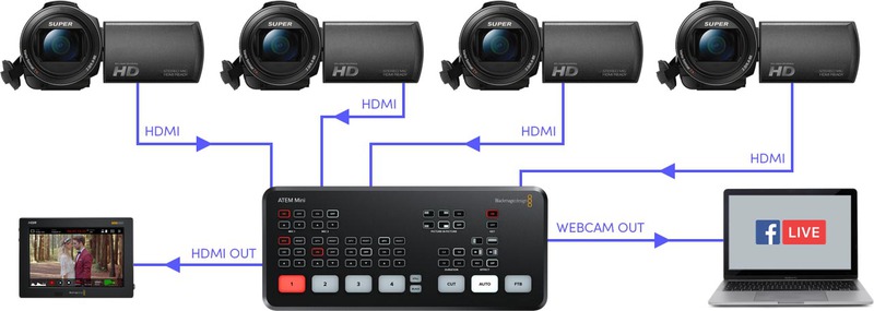 L’ATEM Mini Pro, un mixeur audio Fairlight avec EQ et dynamique, des DVE pour des effets d’image dans l’image, des transitions, un incrustateur chromatique sur fond vert, 20 images fixes pour les titres dans la bibliothèque de média. L’ATEM Mini Pro permet aussi d’enregistrer directement sur des disques flash USB en H.264 et de faire du streaming en direct sur internet.